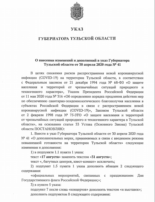 Указ Губернатора Тульской области от 17.08.2020 № 94 "О внесении изменений и дополнений в указ Губернатора Тульской области от 30 апреля 2020 года № 41"