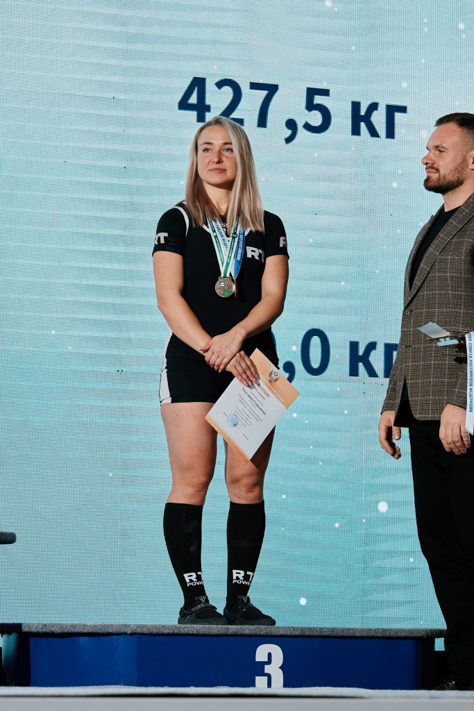 Воспитанница МБУДО СШОР "Юность" Герасимова Екатерина стала бронзовым призером соревнований в дисциплине троеборье классическое в весовой категории до 69кг, набрав в сумме троеборья 390 кг.